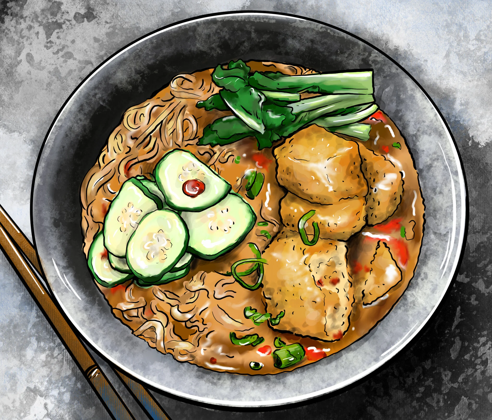 Our vegan version is based on a Tanatamen: a spicy, sesame-based broth that is inspired by the popular Sichuan dish of Dan Dan noodles. The base of this ramen is made using a kombu dashi stock, which is the key to its deep umami flavour.